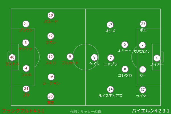 後半も試合の流れはバイエルン。ニャブリが再三ゴールに迫るも枠外。55分には再びケインがクロスからヘディングを放ち、バーを直撃する場面も。フランクフルトは守備を立て直し、中盤でのボール保持を目指すも、バイエルンの素早いプレッシングと中央の統制に苦しむ。