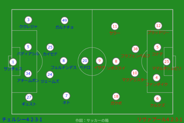 前半14分、ホームのチェルシーが試合を動かす。左サイドから中央に絞ったMFカイセドがリヴァプールの中盤を突く形でボールを保持。中央を駆け上がりPA外から思い切りよくミドルシュートを放つ。ボールは見事にゴール右上隅へと突き刺さりチェルシーが先制し、ホームのスタンフォード・ブリッジは大いに沸いた。
