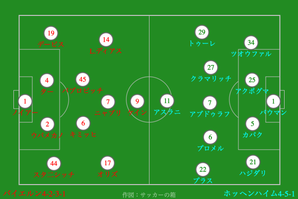 前半はホッフェンハイムDF退場もありバイエルンがリードして折り返す