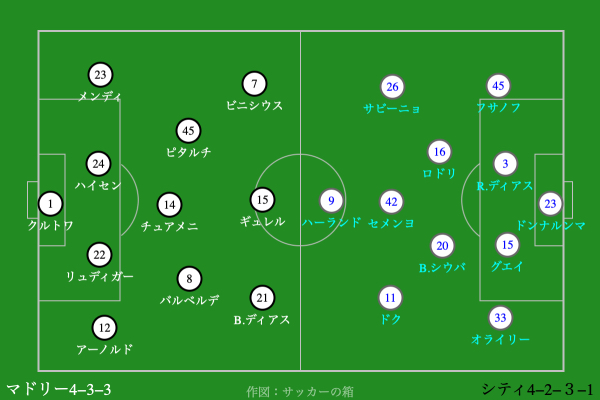 特にセンターバック陣はシティFWハーランドへのパスコースを徹底して封じ、決定的なシュートを許さなかった。マドリー守備陣の集中力の高さでハーランドはこの試合ほとんど仕事をさせてもらえなかった。途中出場の選手も守備に貢献し、試合はそのまま3−0で終了した。