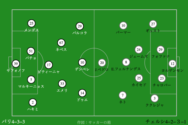 前評判では昨季CLを制したホームのパリSGがやや優勢と見られていた。リーグ・アンで首位争いを続けるPSGは、FWデンベレやMFクワラツヘリアなどスター選手を中心とした攻撃陣でグループステージでも高い得点力を発揮していた。一方でチェルシーは若いチームながら成長を続けており、中盤の司令塔MFエンソフェルナンデスを中心にボール保持と組織的な守備で結果を残してきた。